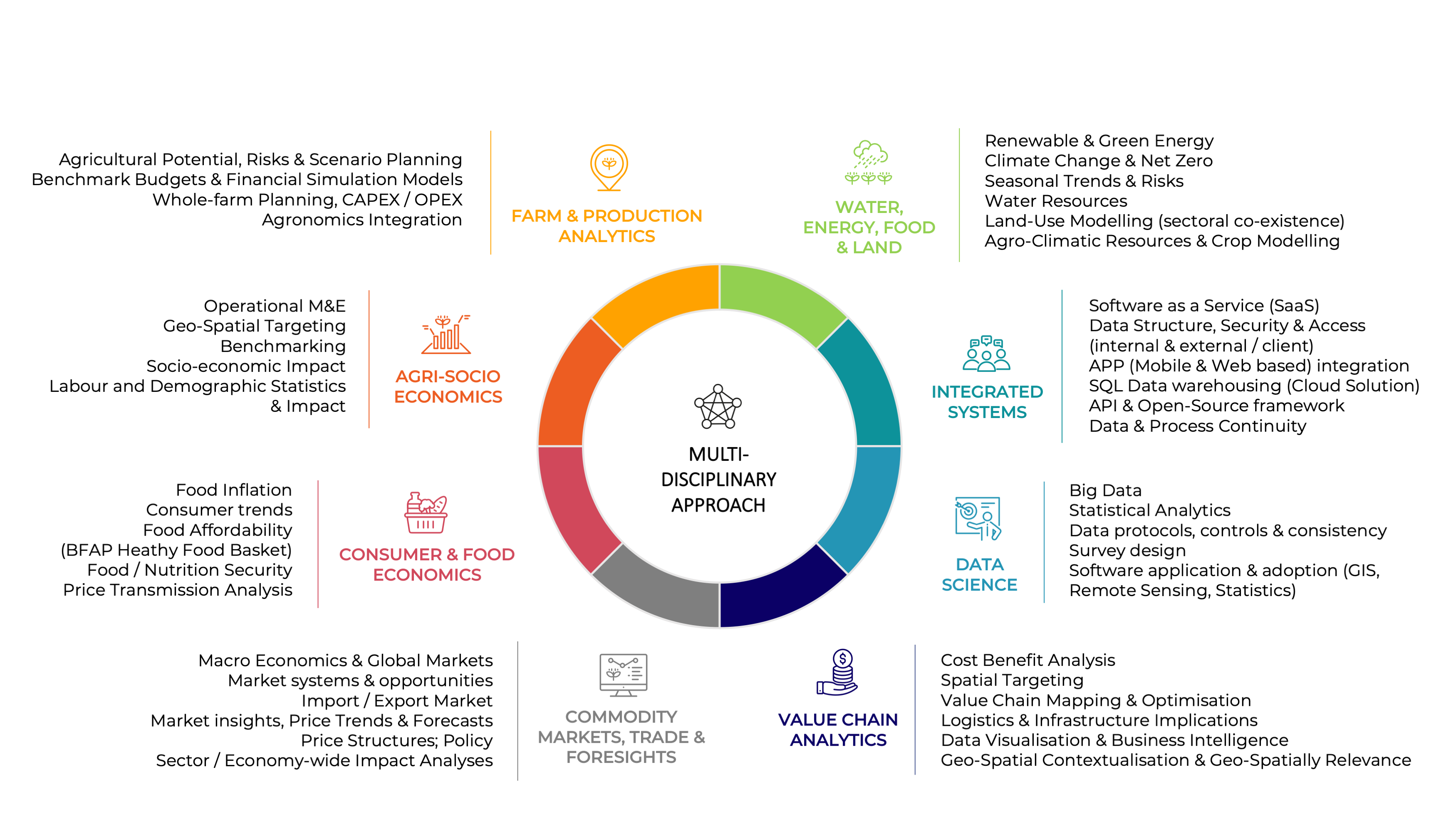 We take a holistic and integrated approach which means our divisions almost always work together as a bigger team to offer the best possible solutions. They include Farm and Resource Analytics, Consumer and Food Economics, Agri-Socio Economics, Commodity Markets and Insight, Value Chain Analytics and Data Science and Integrated Systems Solutions.